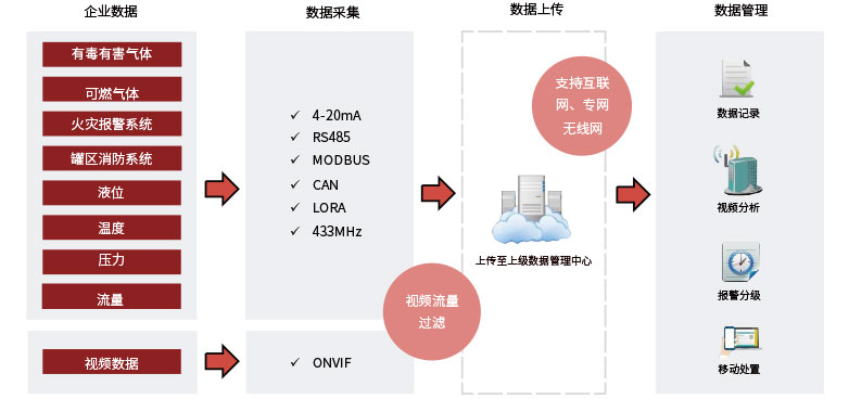 在线监测预警系统通过在危险源(或隐患关键部位)内安装各类传感器和视频监控设备,通过网络将各仪器仪表数据采集汇总,实现对厂区内危险气体 / 有害物质泄漏实时监测,数据统一由后台软件进行智能分析和处理,当达到报警临界点时,系统将会以声光、抖屏、短信、广播等方式提醒值班人员进行预警处理及隐患排查。值班人员可通过查看现场联动视频,实时掌握危险源现场安全生产状况,进行决策分析,确保企业的人员和财产安全,减少企业发生危险事故的概率,提高企业的经济效益,达到企业安全生产的目标。