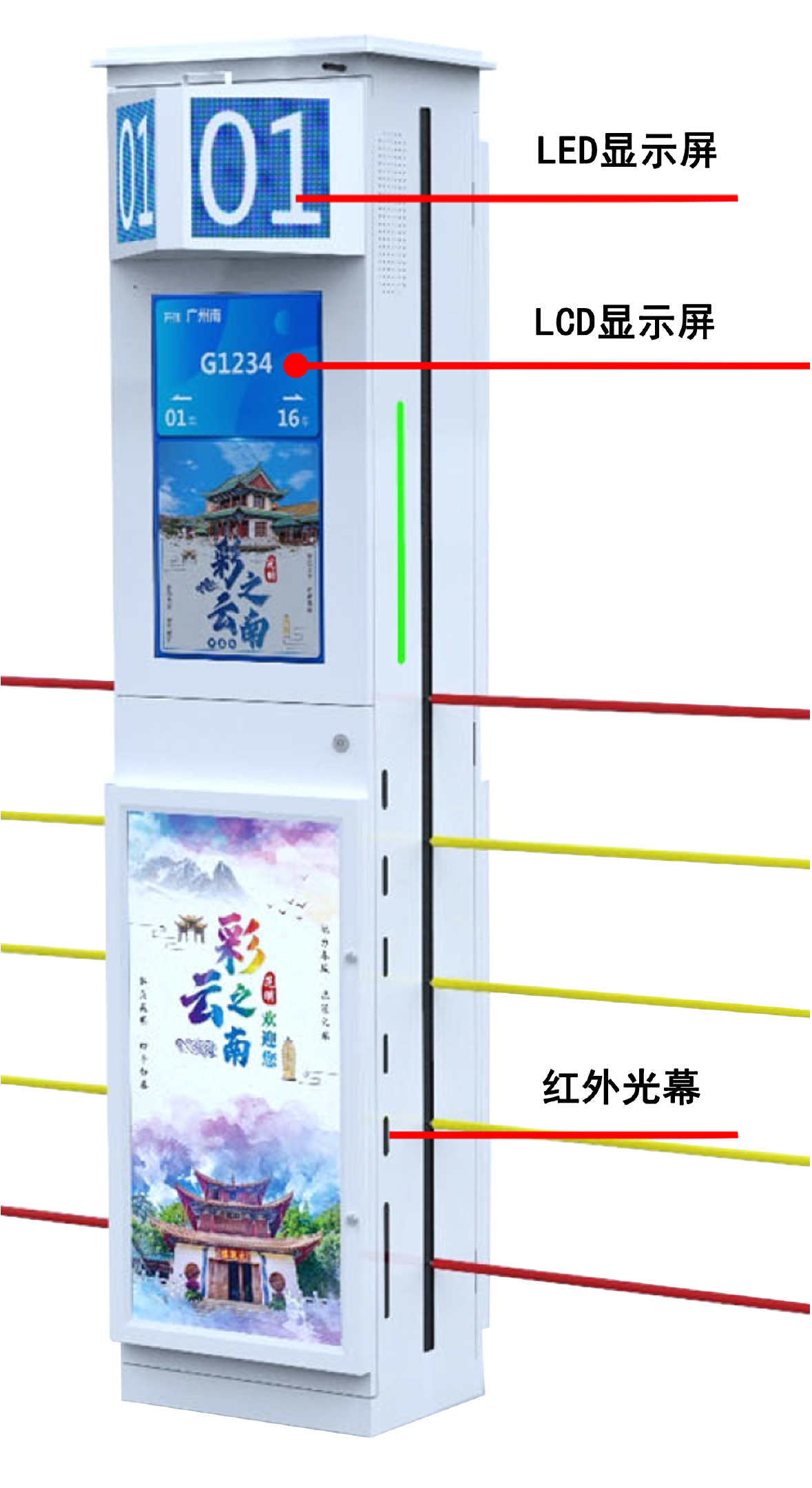 升降立柱上的LED屏上显示到达车次、到发时刻、车厢编号等,方便旅客寻找车厢位置,减少了上错车的可能。